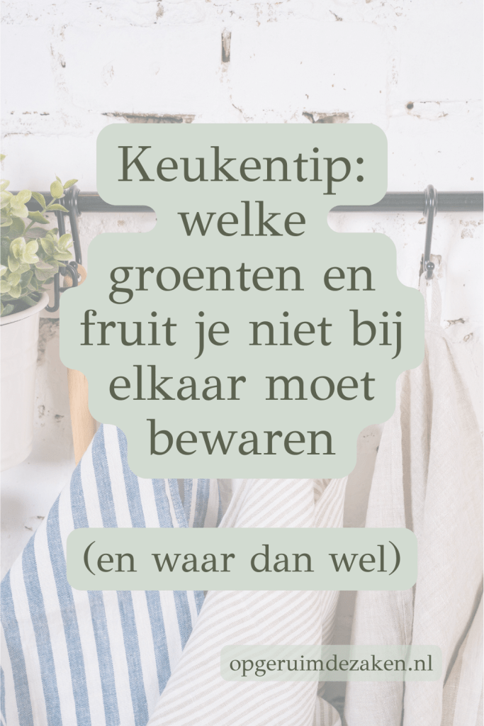 - appels, peren, bananen, perziken, tomaten en ui bewaar je altijd apart: deze scheiden het gas ethyleen uit, wat rijping van ander fruit en groenten bevordert